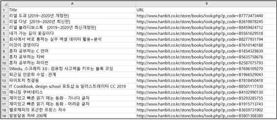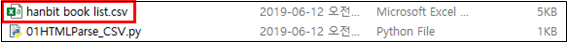 csv 파일이 저장될 경로를 따로 지정해주지 않았기 때문에 파이썬 파일이 저장되어 있는 경로에 csv 파일이 저장된다. 저장된 hanbit book list.csv 파일을 확인하면 다음과 같다.