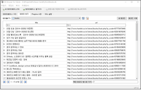 db 파일이 저장될 경로를 따로 지정해주지 않았기 때문에 파이썬 파일이 저장되어 있는 경로에 db 파일이 저장된다. 저장된 books.db 파일을 SQLiteDatabaseBrowserPortable 프로그램으로 확인하면 다음과 같다.