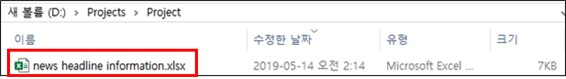 또한 지정해준 파일 저장 경로로 가보면 다음과 같이 “news headline informaiont.xlsx”의 엑셀 파일이 저장된 것을 확인할 수 있다.